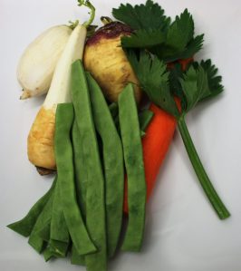 En un plato poner la sopa y encima las tiras de verduras, los tacos de jamón y una ramita de perejil.