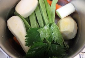 Pelar todos los ingredientes e introducir en un olla rápida junto con el agua, sal y aceite. Poner a fuego fuerte. Cuando suban los tres anillos o comience a pitar bajar el fuego al mínimo y dejar 15 minutos. Mucho cuidado al abrirla!!!! Aseguraros que ya no queda vapor dentro.