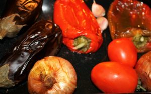 Pelar todas las verduras. Tanto de las berenjenas como de los pimientos tenemos que eliminar todas las semillas.