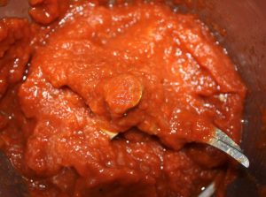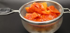 Pelar los tomates. Colarlos para recuperar el agua que han soltado. Añadir una cucharadita de azúcar para contrarrestar la acidez del tomate. Reservar este jugo que también utilizaremos para hacer la sopa.