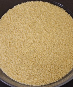 La sémola se vende de distintos granulados, fino, mediano y grueso. El que se utiliza para el cous cous que se sirve con caldo es el de grano mediano.