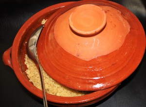 Si tenéis un tajin, recipiente árabe para servir tanto el cous cous como muchos otros platos, genial. En mi caso he utilizado una cazuela de barro con tapa.