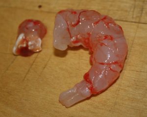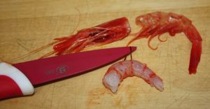 Si la parte de la gamba que estaba en contacto con la cabeza tiene un poco de negro se corta el borde.
