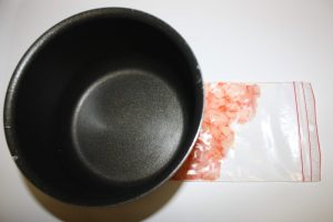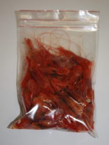 En una bolsa de cierre fácil ( yo he utilizado una cuyo ancho es de 10 cm ), introducir las gambas, en este caso 9 piezas por bolsa.
