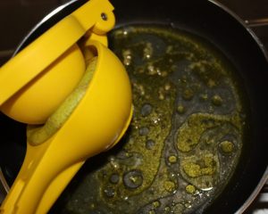 Sacar del fuego y exprimir limón para cortar la cocción. Si se fríe demasiado amargará.