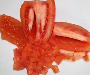 Para terminar cortamos el tomate por la mitad, eliminamos las semillas y hacemos cuadraditos.