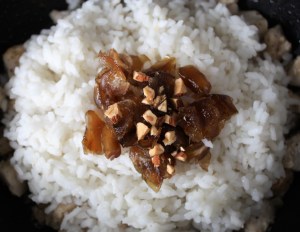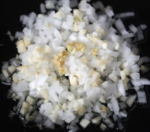 Picar la cebolla y el ajo. Rehogar en una sartén junto con el jengibre rallado, con el aceite, a fuego suave durante 10 minutos, moviendo de vez en cuando para que no se nos dore.