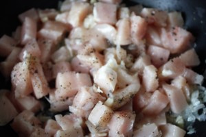 Cortar la pechuga de pollo en dados.