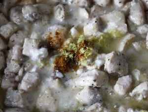 Es el momento de añadir el curry, ralladura de limón, zumo de limón y leche de coco. Dejar otro 5 minutos a fuego fuerte moviendo constantemente.