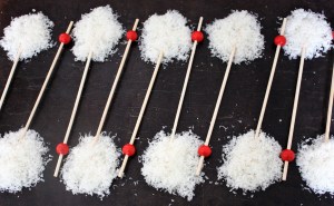 En un silpat o papel para el horno colocar montoncitos de queso, aproximadamente una cucharada por piruleta. Poner en cada uno de los montones un palito que llegue a la mitad del círculo y cubrir con un poco de queso, de esta manera no se nos desprenderá el palo.