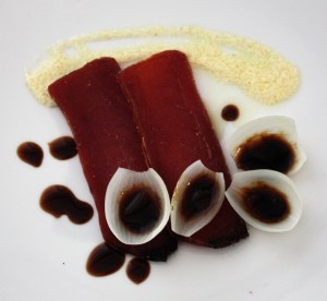 EMPLATADO: colocar un poco de mayonesa de pistachos, encima las cortadas de mojama y acabar con la cebolla rellena de vinagre y aceite. Decorar con unas gotas de reducción de vinagre de Módena.