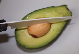 Partir el aguacate por la mitad. Clavar el cuchillo en el hueso, girar, tirar de él y separarlo de la pulpa. Con una cuchara sacar la carne del aguacate o bien pelar las dos mitades si queremos hacer gajos.