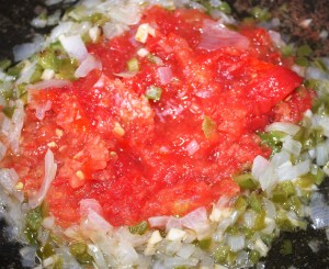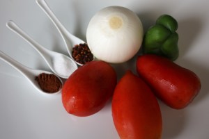 Para hacer el sofrito: un tercio de pimiento verde italiano (25g), media cebolleta (50g), 3 tomates maduros de pera (200g), 1 ajo, 1 cucharadita de ñora picada (o pimiento rojo seco), 1 cucharadita de sal y otra de azúcar, 7 cucharadas soperas de aceite 0,4º y una cucharadita de pimentón dulce.