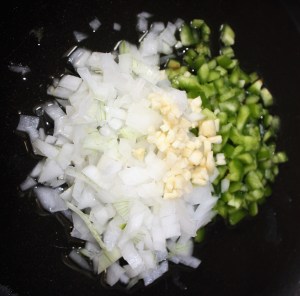 Picar el pimiento verde, la cebolleta y el ajo. Pochar en una sartén con las 7 cucharadas de aceite a fuego suave durante 15 minutos.