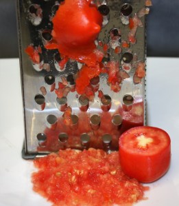 Añadir el tomate rallado y una cucharadita de azúcar, para contrarrestar la acidez del tomate. 5 minutos a fuego medio sin dejar de mover para que no se queme. Dejar otros 5 minutos a fuego bajo.