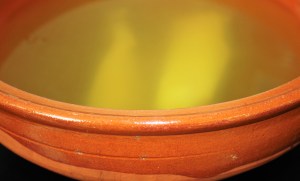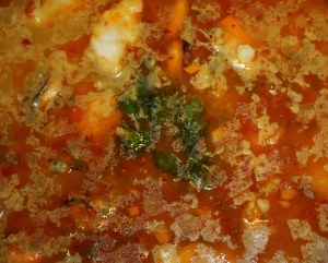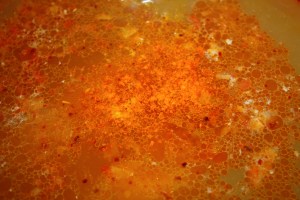 Como sabéis, a mí me gusta cocinar con cazuela de barro pero utilizar la que tengáis. Poner los 500ml de caldo de pescado, el litro de agua, la espina de rape y un poco de colorante para que el arroz salga amarillo. Salar. Dejar cociendo media hora y mientras tanto comenzar con el sofrito.
