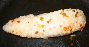 En la misma sartén donde hemos hecho el sofrito dorar el lomo de rape, solamente un minuto por cada lado y cortarlo en rodajas.