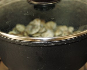Abrirlas de la misma maneras que las chirlas, en un olla tapada, a fuego fuerte sin nada. 3-4 minutos. En cuanto se abran apagar el fuego.
