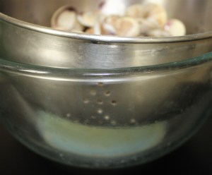 Dejar a remojo las chirlas en agua con una cucharada de sal. De esta manera eliminarán la arena que contengan. Tenerlas como mínimo media hora.