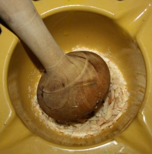 Hacer un majado en el mortero con las almendras, ajo y pan.
