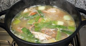 Chascar las patatas (cortarlas a trozos arrancados al final para que suelten el almidón y espesen el caldo sin tener que utilizar espesantes artificiales).