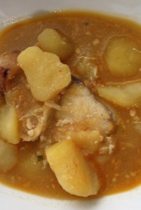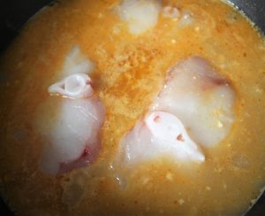En el momento de comer, calentar el caldo con las patatas y añadir una cortada de rape por persona ( para esta cantidad de fumet 4 cortadas ).