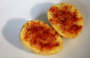 Lavamos las patatas y las cortamos por la mitad, a lo largo. Hacemos cortes a lo largo y ancho, formando cuadrados, sin llegar al final. Ponemos por encima sal y pimentón ( puede ser dulce o picante, depende de lo que os guste ).