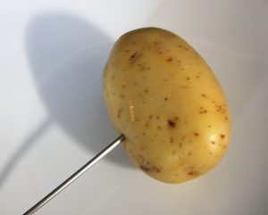 Las hacemos en el microondas. Lavar las patatas, pinchar con un pincho o tenedor y meter en el microondas durante 5 minutos a potencia máxima. Sacar, pinchar. Si todavía no están tiernas volver a meter 3 minutos y así hasta que al pinchar entre perfectamente el pincho o tenedor. Depende del microondas pero con unos 8 minutos están perfectas.