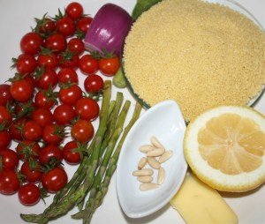 En un bol mezclar el cous cous, cebolleta, espárragos, piñones con el aceite de tostarlos, hojas de albahaca, zumo de limón, pimienta negra recién molida, pimentón picante y cayena picada. Probar de sal y si esta soso añadir un poco.