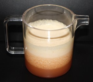 Se forma una capa de espuma en la superficie. Cuando está muy frío lo sacamos de la nevera y con una cuchara eliminamos la espuma. Vertemos este zumo sobre el puré de plátano.