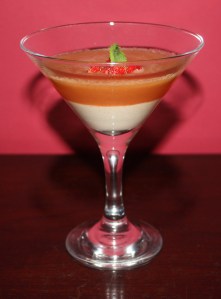 Poner a remojo la gelatina en agua fría 5 minutos. Calentar la nata que hemos reservado, escurrir la gelatina con las manos y añadirla a la nata caliente. Incorporar al puré, rellenar la base de las copas y meter en la nevera para que se endurezca.