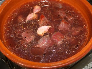 Poner en la cazuela, la carne cruda en dados, los ajos con piel, el vino, el aceite, el azúcar, sal, bolas de pimienta y…