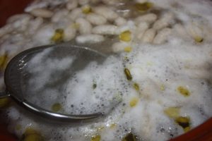 Se baja el fuego, casi al mínimo y se deja cociendo unas 2 horas, hasta que las alubias estén tiernas. Cada media hora añadiremos un vaso de agua fría para asustarlas.
