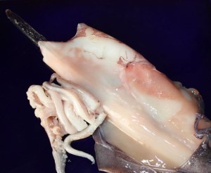 Separar los tentáculos y las aletas, tirando de ellos hacia fuera. Quitar la vaina trasparente.