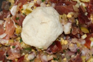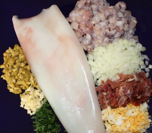 Cebolla y calamar, huevo duro, jamón, aceitunas, ajo, perejil y el pan escurrido.