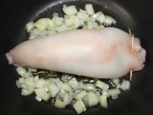 Cuando esté tierna agregar las aletas y patas de calamar, picadas previamente, dejándolo freír unos momentos.