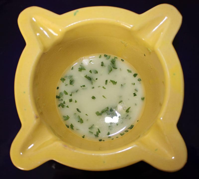 Machacar en un mortero un diente de ajo, unas ramitas de perejil, una cucharada de harina y desliar con el vino blanco.