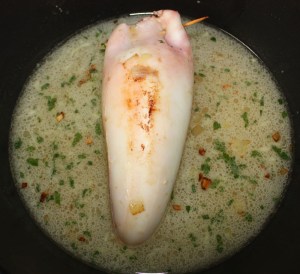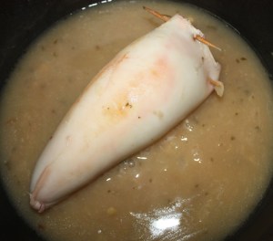 Rellenar el calamar y cerrar con un par de palillos para que no se nos escape la farsa.