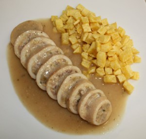Calentar la salsa y acompañar de unas patatas fritas a cuadraditos.