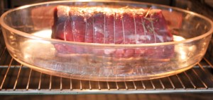 Colocar la carne en una fuente de horno. Regar con el aceite y las hierbas.