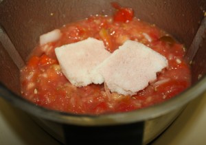 En la thermomix o el robot que tengáis triturar los tomates con piel troceados, la cebolla y el ajo pelado. Cuando esté ligeramente triturado poner media rebanada de pan, la que hemos bañado con el vinagre.