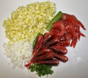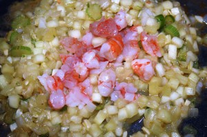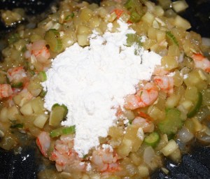 Pelar los cuerpos de las gambas, cortar en trocitos y añadirlo. 2 minutos.