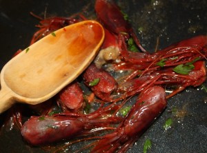 En una sartén con 4 cucharadas de aceite y la mitad del perejil picado poner las cabezas de las gambas. Reservar los cuerpos. Machacar con una cuchara para extraer todo el jugo. Retirar las cabezas, desecharlas y reservar la sartén con el aceite.