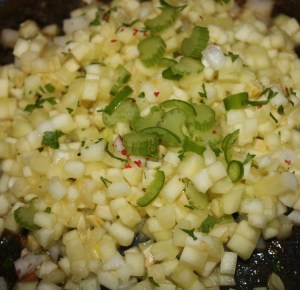 En otra sartén con las otras 4 cucharadas de aceite sofreír las verduras, calabacín, cebolleta y apio a rodajitas. 10 minutos a fuego bajo-medio, unos 10 minutos, hasta que estén tiernas. Mover a menudo para que no se quemen. Salpimentar.