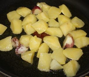 En una sartén con un buen chorro de aceite incorporar las patatas y loa ajos con piel partidos por la mitad.