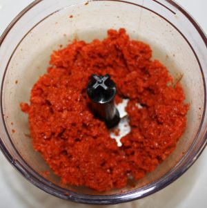 Puré de piminetos: asar los pimientos Una vez ya tenemos los pimientos asados, pelados y sin pepitas, los trituramos y les añadimos sal y aceite virgen extra.