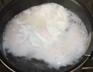 Para hacer el huevo escalfado, si lo preferimos en lugar de frito, poner un cazo al fuego con sal y un poco de vinagre ( para que no se nos desparrame el huevo al echarlo al agua ). Dejar cociendo hasta que cuaje la clara pero sin pasarnos ya que la yema debe quedar líquida.