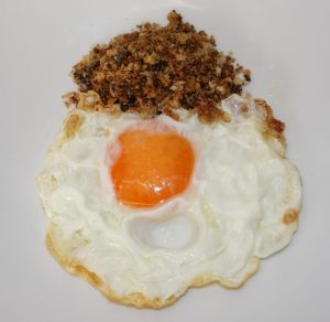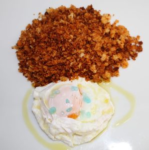 Migas de chorizo con huevo escalfado y sal azul de Grecia.