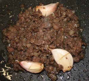En este caso no hace falta triturarla, como es más blanda, simplemente la desmenuzamos en la sartén con un tenedor. Freír con una cucharada de aceite y tres ajos con piel con un ligero corte en el centro.
