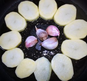 Pelar las patatas, cortarlas en rodajas de 1 cm y dorar junto con los ajos, enteros y con piel. Salarlas.